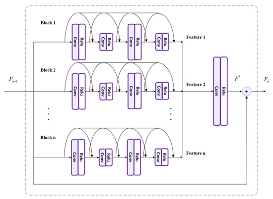 In IR, as shown in Figure 7, a set connection module is added. Each module is composed of several diversity dense connection blocks, local feature fusion and local residual learning. The dense connection module refers to the connection mode in Densenet [20], which creates multiple connection blocks by changing the size, arrangement and proportion of each convolution core in the module. For each connection block, the mapping of the ith layer can be expressed as:
