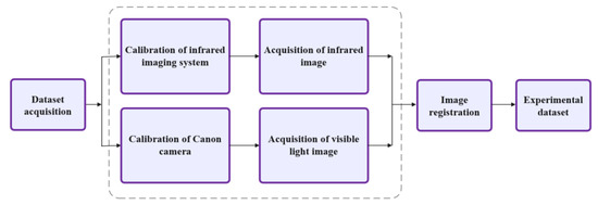 In order to train the depth network effectively, both the variety and quantity of the image database need to be extensive. In this paper, we collected datasets containing IR and RGB images using the designed infrared imaging system and Canon EOS 700D camera (Dafen, Japan). The datasets contain day and night images of the sea scene. For the same scene image, an image registration algorithm based on local self-similarity is used according to the target size and resolution of IR. The whole flow chart is shown in Figure 8. We collected 200 pairs of IR and RGB images with different lighting conditions and scenes to form the experimental data, and combined them with 300 pairs of images selected from the Kaist dataset to form final experimental datasets. We provided the download address of the Kaist dataset at the end of this paper.