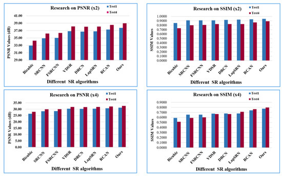 As shown in Table 3, when different magnification and experimental data combinations are used. Our algorithm is superior to six other advanced super-resolution algorithms in which the PSNR value of the proposed algorithm exceeds others. For the 2X test1 experimental data, the PSNR value generated is 0.45 dB higher than that generated by the RCAN and 0.91 dB higher than that generated by the LapSRN. For the test2 experimental data, the PSNR value generated by this algorithm is 0.84 dB higher than that generated by the VDSR and 2.79 dB higher than that generated by the SRCNN. It is obvious from Table 4 that when different magnification and experimental data are applied, the SSIM value generated by the algorithm in this paper is higher than that generated by the other six advanced super-resolution algorithms. For the 4X test3 experimental data, the SSIM value generated by our algorithm is 0.0065 higher than that generated by the DRCN and 0.0215 higher than that generated by the FSRCNN. For the test4 experimental data, the SSIM value generated by this algorithm is 0.0047 higher than that generated by the VDSR and 0.0263 higher than that generated by the SRCNN. Figure 9 shows the values of PSNR and SSIM when different methods are applied under a 2X and 4X of test1 and test4 experimental data, which directly indicates that our algorithm has outperformed others.
