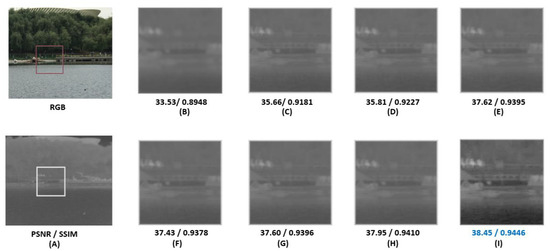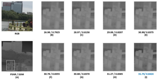 We analyze the above algorithm from the perspective of sensory effects. As shown in Figure 10, Figure 11, Figure 12 and Figure 13, we again compare our proposed method with the six existing methods. Based on the obtained results, our method is capable to clearly reconstruct the textures, lines and edges of the infrared image, thus improving the image quality. The experimental results of enlarging the “dock” picture three times in the test1 are shown in Figure 10. The image recovered by our method shows a better visual experience, and the background clarity is also improved. More specifically, the gap between the pavilions and railings on the wharf is clearly visible. The glossiness and smoothness of the columns in the figure are also significantly improved, and the clouds and buildings in the distance are also nicely recovered. In contrast, other algorithms have more or less deficiencies and unsatisfactory aspects in reconstruction.