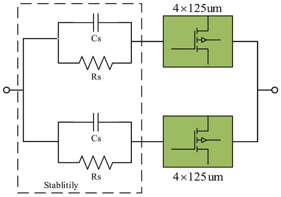 The stability analysis is an essential step in this MMIC PA design. To ensure the stability of the developed MMIC PA, stability circuits were designed for each HEMT. Figure 3 shows the block diagram of the designed stability circuits. A parallel RC network, which is composed of the parallel connection of a resistance and a capacitance, is inserted at the gate of the GaN HEMT. Figure 4a,b give the simulation results of the maximum gain and stability factor, respectively. It can be seen that the simulated stability factors are higher than 1.03 throughout a frequency from 0 to 20 GHz, which confirms that the designed stability circuit can effectively improve the stability.