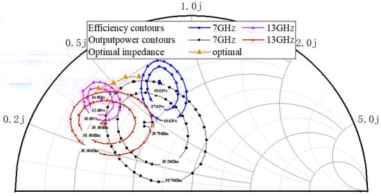 The design of a high-efficiency power amplifier requires obtaining the optimal impedance region within the target frequency band. In this paper, we adopt the method of a load–pull simulation to obtain the optimal impedance. Table 2 gives the load–pull simulation result of the two parallel HEMTs with stability circuits for the power stage of the developed MMIC PA. These optimum impedance points are selected based on tradeoffs among the PAE, , and bandwidth. It is also observed that the optimal load impedance of the device is not constant for the whole frequency. Within the frequency range of 7–13 GHz, the and PAE are better than 37 dBm and 54%, respectively. Figure 5 gives the load–pull contours of the , PAE, and ideal load impedance at 7 and 13 GHz.