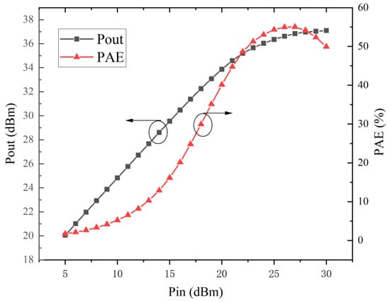 To ensure a high-frequency performance of this PA, thereby improving the gain flatness, the optimal load is chosen to be 12 GHz. Figure 6 gives the simulation result of the and PAE versus the input power () at 12 GHz for a 2 × 4 × 125 µm GaN HEMT with an optimal load impedance under CW conditions. It can be seen that as the increases, the gradually increases. The peak value of the PAE appears around = 27 dBm, at the same time, the also reaches a relatively high power level.