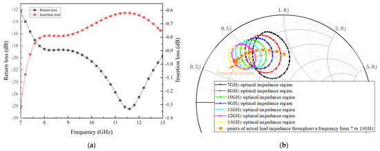 The structure of the OMN is simple; the insertion loss is reduced as much as possible on the premise of satisfying conjugate matching. The insertion loss and return loss of the OMN are shown in Figure 8a. It is seen that the loss of the output matching circuit is 1.3–0.6 dB across the frequency range of 7–13 GHz, with a return loss of better than 12 dB, which means the developed amplifier has a high efficiency and high performance. Figure 8b demonstrates the matching effect reflected by the output matching network. It can be seen that the points of actual load impedance are basically located in the optimum impedance region throughout a frequency from 7 to 13 GHz, that mean a good output matching is achieved.
