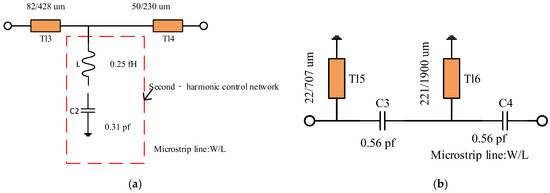 The advantage of Method 1 is that both Impedances A and B can be considered to be transformed from the 50 Ω standard impedance, which is relatively stable and reduces the influence of the optimal source/load impedance change caused by the change in the working state of the HEMT on the matching accuracy; the disadvantage is that the matching network will become complex, thereby increasing the chip area. The advantages of Method 2 are that Impedances A and B are directly transformed from each other, the matching network is simple, and the chip area is saved; however, the difficulty of the matching network design will also increase. After, comprehensive consideration, this design adopts Method 2 to design the IMN. Simultaneously, in order to improve the efficiency, the second-harmonic control network is used in the IMN, which is composed of an inductor and a capacitor in series. The circuit structure of the IMN is shown in Figure 10a. It can be observed that the structure of the matching network between the two stages is simple and occupies a small chip area. The design of the IMN takes into account the same factors as the design of the OMN. Figure 10b presents the structure of the proposed IMN.