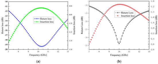 The insertion loss and return loss simulation results of the ISMN are shown in Figure 11a. With a return loss better than 12 dB, the insertion loss is 1.4–0.7 dB across the frequency range of 7–13 GHz; the simulation result of the IMN is shown in Figure 11b. With a return loss better than 10 dB, the insertion loss is 2.8–1.2 dB across the frequency range of 7–13 GHz.