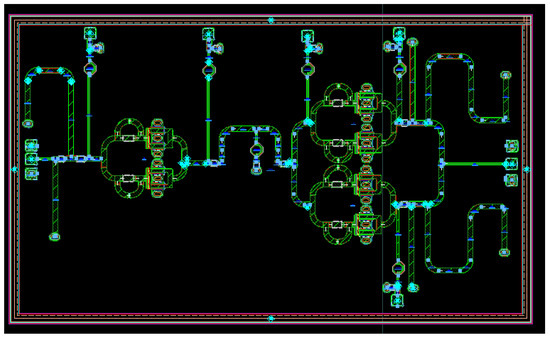 This two-stage GaN MMIC PA is implemented in a 0.25 μm gate length GaN/SiC HEMT process. Figure 12 demonstrates the final layout of the designed MMIC PA. Including the testing pads, the design occupies a size of 4.5 × 2.6 mm2.