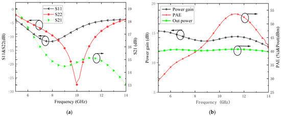 In order to verify this design, the developed GaN PA adopts a Class-AB bias point with a drain voltage of 28 V, a gate voltage of −2 V, and a total gate current of 954 mA. The electromagnetic simulated(EM) S-parameters of the layout are shown in Figure 13a. It can be seen that in the frequency range of 7–13 GHz, the amplifier achieves a small signal gain of 14.5–15.5 dB with a gain flatness of less than ±1 dB, and the input and output return loss are better than 5 dB and 8 dB, respectively. Moreover, the simulated PAE and results of the large signal are illustrated in Figure 13b. The designed MMIC PA achieves a PAE of 30–46% with an of 40 dBm over the entire 7–13 GHz bandwidth.
