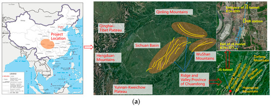 Chongqing is one of the central cities in western China. It is also an important hub for the medium and long–term plans of China’s eight horizontal and eight vertical high–speed railway networks, and it occupies an important position in China’s railway transportation. It is located in the Ridge and Valley Province of Chuandong, and the landform is dominated by mountains and hills, of which mountains account for more than 76%, which is known as a mountain city. Thus, tunnels have become key projects in local engineering [1,2]. The main geological and environmental characteristics in the Chongqing region are as follows: interbedded deposits of mudstone and sandstone are widely distributed and belong to a typical red layer [3]; crustal movements are very active; rainfall is abundant and strong [4]. These geological and environmental characteristics may produce a complex in situ stress field. Meanwhile, the surrounding rock is dominated by soft rock, which is easily softened by water. Such landforms and poor geological conditions adversely impact the construction of tunnels, such as large deformation, which often leads to the failure of the surrounding rock and supporting structure of the tunnel [5,6]. For example, the Jiazhuqing tunnel [7], Yacambú–Quibor tunnel [8] and Simplon tunnel [9] all experience large deformations due to the soft surrounding rock and poor geology conditions. In addition to large deformations, tunnel collapse, water and mud inrush are also common geological disasters in soft rock tunnel construction [10,11]. Therefore, an in–depth study of the mechanical properties of rock masses is highly necessary for the typical difficult tunnel projects in this area. It will help estimate the possible risks of tunnel excavation, and it has important guiding significance for the design and construction of tunnels in similar geological areas.