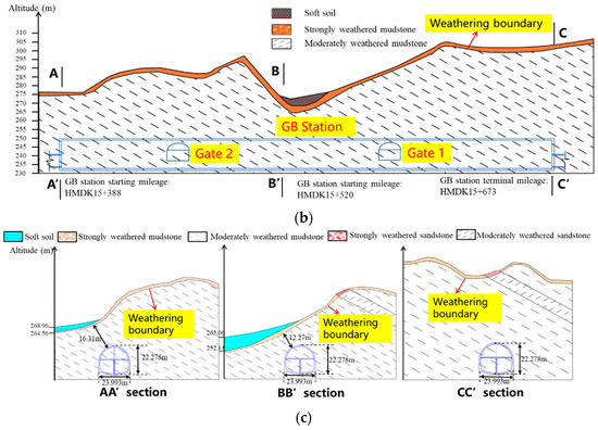 (a) Guobo underground station located in the complex geological environment of the Ridge and Valley Province of Chuandong; (b) longitudinal section and (c) typical X–sections and corresponding stratum of Guobo Station.