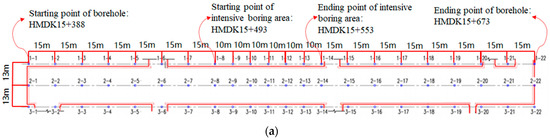 As shown in Figure 2, the boreholes in the project area of the station are divided into the body section and the portal section. The borehole range of the body section is from HMDK15 + 388 to HMDK15 + 673, including an intensive boring area from HMDK15 + 493 to HMDK15 + 553. Three rows of boreholes are arranged longitudinally; one row is arranged in the centerline of the tunnel, two rows are arranged at 13 m on each side of the centerline of the tunnel, and 22 boreholes are bored in each row. A total of 66 boreholes are drilled in less than 300 m, and the borehole density of the body section is extremely high. Meanwhile, there are two boreholes, 4–4 and 4–6, at the tunnel entrance section. The boreholes reveal that the lithology of the rock cores taken from borehole 4–4 is sandstone and that the lithology of the rock cores taken from the other boreholes is mudstone.