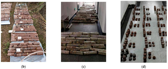 Rock core drilling and specimen preparation: (a) borehole arrangements along the Guobo underground station; (b) rock cores from in situ boreholes; (c) transport to laboratory; (d) prepared rock specimens from rock cores.