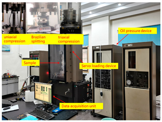 The UCT, BST and TCT were carried out using the MTS 815 triaxial physical property test system (Figure 3) developed by Mets Industrial Systems Co., Ltd. (Adachi, Tokyo) This servo–hydraulic system has high sensitivity and is an accurate and advanced piece of rock mechanics test equipment. The maximum uniaxial load can reach 4600 kN, the maximum triaxial load is 2600 kN, and the confining pressure can be increased to 140 MPa with only a 0.5% error. During the tests, the loading mode was set as the displacement control at a loading rate of 0.12 mm/min.