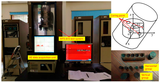 The in situ stress measurement tests were carried out by the MTS 815 system and PCI–II multichannel acoustic emission instrument (Figure 5). The core specimens for the in situ stress measurement of the project area were obtained with a cover depth of approximately 60 m. For the selected cores, a new incorporating non–oriented core ground reorientation method was used to locate the surface accurately [25], and then the “four–direction method” was adopted to obtain samples (Figure 5). The four–direction method involves drilling three samples in the vertical direction to determine the vertical in situ stress by obtaining the Kasai points of the samples. Four samples are drilled at 45° intervals in the horizontal direction at three angles to determine the direction of the horizontal maximum principal stress, the horizontal minimum principal stress, and the horizontal principal stress by obtaining the Kasai points of the samples.