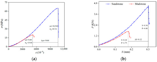 Typical stress–strain curves (a) and the load–displacement curves (b) of the mudstone and sandstone specimens under UCT and the BST.