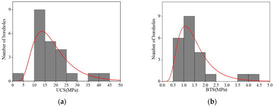 Distribution of UCS (a) and BTS (b) of mudstone specimens from the project area.