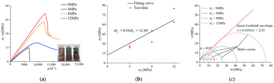 Typical stress–strain curves and failure mode (a) of mudstone specimens under triaxial compression tests; (b) Mohr–Coulomb strength curve; (c) Mohr’s circles with a linear Coulomb envelope.