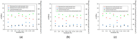 In situ stress measurement results and the maximum horizontal principal stress direction: (a) the first row, (b) the second row, and (c) the third row at the Guobo station.