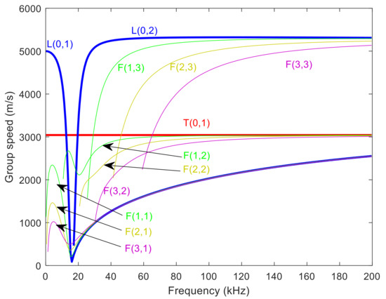 Group velocity dispersion curves of an aluminum pipe with an outside diameter of 102 mm.