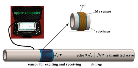 The specimens used in the experiment were a batch of thin aluminum pipes with dimensions of 102 mm × 1.5 mm (outside diameter × wall thickness). The damage was manufactured in a properly middle position along the axial direction. The guided wave transducer was a single magnetostrictive one. With the help of the signal generation and reception equipment (MsSRv5, SwRI, San Antonio, TX, US), the transducer can be used to excite and receive the guided wave signals with the time-sharing mode, thus realizing the pulse-echo mode, as shown in Figure 2.