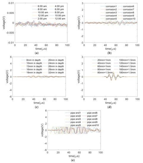 Ten signals for each type were plotted in Figure 5, in which the available signals were intercepted as 100 μs length from their original test signals at the sampling frequency of 1 MHz. For every damage type, the signals were obtained from different sizes of damage and different lengths of pipes to simulate as many damage states as possible. Furthermore, they were measured at different times of day, which means that the experiments were conducted under different environmental conditions. This increased the robustness of damage classification. Moreover, the signals were normalized within the full range; therefore, the amplitudes of intercepted signals were very different in Figure 5.