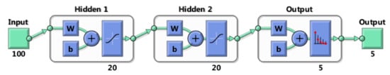 The sizes of the input, hidden, and output layers were set to 100, 20, and 5, respectively. The softmax function was selected as the classifier in the output layer, which is expressed in Equation (5). The activation function in the hidden layers is an all hyperbolic tangent sigmoid function tansig, i.e., tanh, which solved the zero-centered output problem in the sigmoid function. The expression and geometry image of tanh can be seen in Equation (6) and Figure 6, respectively. To investigate the effect of the hidden layers number, neural networks containing one and two hidden layers (called multi-layered perceptron, as shown in Figure 7) were built, respectively. The results are shown in Table 2.