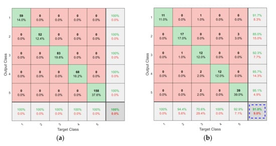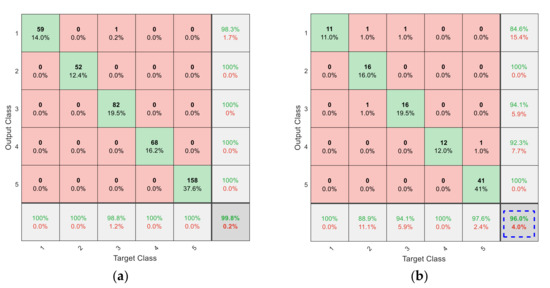 Training and test confusion matrices of neural network with ReLU hidden layers: (a) training confusion matrix; (b) test confusion matrix.