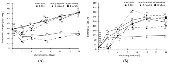 The peptide fraction content of G-fillets marinades significantly increased only up to the fourth day, reaching 92–103 mg (Figure 7B), which is characteristic for the German method [32]. On the other hand, during marinating of whole and headed herring, the peptide content increased up to the tenth day, reaching 232–234 mg PHP(R). In the Danish method, the peptide content decreased by a few mg after 2 days due to an increase in the moisture of the salted meat, after which it sharply increased to 7 days in fillets and headed herring or to 14 days in whole herring. After 7–10 days, marinades from fillets and headed herring obtained by the Danish method contained more peptides compared to the German method (Figure 7B). Peptide content was not significantly different after 7–10 days for whole herring marinated using both methods. This shows that the inhibition of cathepsin D by salt, and the lower dynamics of mainly peptide formation in the Danish method than in the German method, were balanced by high digestive protease activity. Additionally, the content of the amino acid fraction changed during marinating, similar to the content of NPN and peptides. After 7 days of marinating, G-fillets marinades contained the least PHP(A) (55.8 mg), followed by D-fillets (73.7 mg), G-whole (81.6 mg), G-headed (90.3 mg), D-whole (96.9 mg), and the most, D-headed (106.1 mg) (Figure 7C). For the amino acid fraction, the increase in content was characteristic up to 7–10 days in fillets, while up to 14 days in marinades from ungutted herrings.