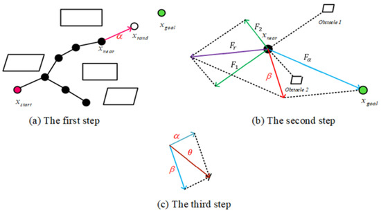 The key steer function algorithm (line 9) can be realized with three steps, as shown in Figure 4. Step one is to calculate the sum vector of and (Figure 4a). Step two uses APF to calculate and , and then calculates the sum vector (Figure 4b). The last step is to calculate the sum vector of and (Figure 4c).