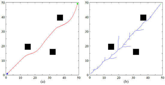 To verify the superiority of the algorithm, we first compare the APF-IRRT* with APF algorithm alone. We first construct a grid map as 50 m × 50 m, and set (1, 1) and (49, 49) as start point and target point, respectively. Three obstacles, which are represented by black squares, are set at (15, 20), (32, 16) and (36, 40), respectively. The parameters of APF are set as: attractive coefficient , the maximum attractive force , repulsive coefficient , and repulsion distance . The maximum number of iterations is set to 1000, and the step size is set to 0.4.