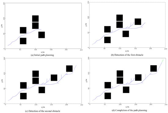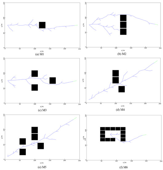 In this section, the grid map used to model the environmental information is set to 150 m × 250 m. The parameters of APF are set as: attractive coefficient , the maximum attractive force , repulsive coefficient , and repulsion distance . The maximum number of iterations is set to 3000, and the step size of and are both set to 5.
