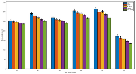Figure 7 also shows that the standard deviation for the 20 independent experiments of the APF-IRRT* algorithm, compared with other four algorithms, is superior in each test environment. Similarly, taking the test environment M5 as an example, the RRT*, IRRT*, A*-RRT* and P-RRT* algorithms obtained a standard deviation of 9.21, 7.46, 6.45, and 4.60 m, respectively, while the standard deviation of APF-IRRT* algorithm was 3.35 m. This reveals that the path length value of the APF-IRRT* algorithm is closer to the mean value in each experiment, which indicates that the proposed algorithm has lower deviation than the other three algorithms. We can also see from Figure 7 that the more complex the environment is, the more apparent the superiority of the standard deviation of APF-IRRT* algorithm over the other algorithms is. For example, in test environment M1, the RRT*, IRRT*, A*-RRT* and P-RRT* algorithms obtained a standard deviation of 6.54 m, 5.00 m, 4.05 m, and 4.16 m, respectively; the standard deviation of APF-IRRT* algorithm was 3.18 m. This gives a difference of 3.36, 1.82, 0.87, and 0.98 m between the RRT*, IRRT*, A*-RRT*, P-RRT* algorithms and the APF-IRRT* algorithm. While in test environment M5, the differences are 5.86, 4.11, 1.41, and 1.25 m, respectively. It is indicated that compared with the other three algorithms, the APF-IRRT* algorithm has an advantage in complex environments.