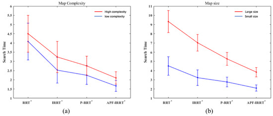 Figure 10a shows a comparison of search times for the four algorithms in the test environments M2 and M5. The results were obtained by repeating the simulations 20 times independently. We can see from the figure that the complexity does not change the trend of the curves, nor change the superiority of APF-IRRT* algorithm over the other three algorithms. It indicates that the proposed APF-RRT* algorithm has a good ability to adapt to the complexity of the map.