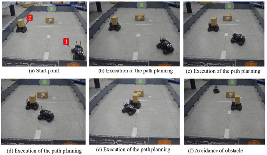 To test the ability of avoiding dynamic obstacles for APF-IRRT* algorithm in a real environment, we performed the experiment with two Mecanum wheel omni-directional mobile robot U-cars, robot 1 was used as a main robot, robot 2 was used as a dynamic obstacle. To distinguish the two robots, the robot 1 was set to move backward, and its linear velocity and angular velocity were set to 0.4 m/s and 1 rad/s, respectively. Robot 2 was set to move forward, and its linear velocity and the angular velocity were set to 0.2 m/s. A set of images of the test results, which show how the robot moves at different positions, is shown in Figure 13. As shown in Figure 13, we can see that the main robot can avoid dynamic obstacles well.