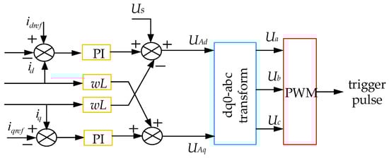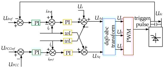 The control method of the reactive power and grid connection point voltage is to compare the reactive power output in the grid connection point voltage Upcc or SVG with the reactive power reference, and to obtain the q-axis current reference value iqref. The voltage of the stable grid-connected point is determined through the reference value, or the reactive power required for the output with the reference value is directly adjusted [,]. The current reference value satisfies the following equation: