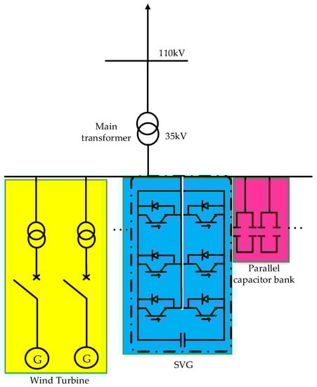 Due to the reverse distribution of energy and load in China, large-scale thermal power and clean energy need to be transmitted to the receiving end grid over long distances and across regions, while the ultrahigh voltage direct current (UHV DC) transmission project is responsible for the arduous mission of Xinjiang power transmission [,]. Since the operation of ±800 kV Tianzhong DC, the wind power in the Hami area has been continuously transported to the power load center. However, the large-scale wind power grid connection has also brought voltage fluctuations and other influences to the region, which has severely challenged the stability of the power grid [,,,]. In recent years, the rapid development of the static reactive power generator SVG device represents the latest reactive power compensation system. It has a rapid response, wide operating range, and can suppress voltage flicker, but its complex structure and high cost make it difficult to be used on a large scale. Therefore, it is of high practical significance to study a new type of combined reactive power compensation device which would have both the cost advantage of traditional reactive power compensation device SC and the continuous smooth adjustment ability of SVG device.