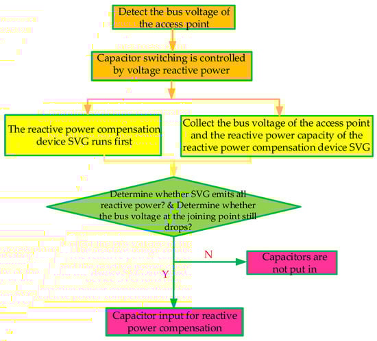 Conventional capacitor banks generally choose the SC type. Usually, to avoid frequent switching of SC capacitor banks, a compensation margin (Y) will be set within the reactive power range. If the power grid system has been put into k groups of capacitor banks as reactive power compensation, then: (1) when Q > (k + 1)Qc + Y, put in the k + 1 group of capacitor banks; (2) when Q < kQc − Y, exit the k-th capacitor bank. Setting the compensation margin not only avoids the frequent switching of capacitor banks, but also ensures the linear demand of the system for reactive power. The control system flow of the hybrid reactive power compensation is shown in Figure 4 below.