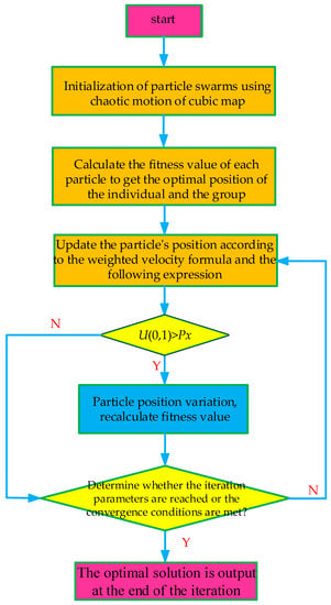 Flowchart of the adaptive variation operator chaotic particle swarm algorithm.