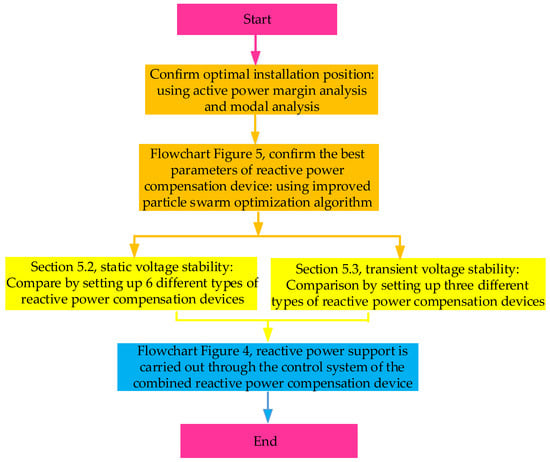 In Figure 7, the reactive power control method for the combined flow chart is shown. The control method first uses active power margin analysis and modal analysis to confirm the optimal installation position of the reactive power compensation device. Secondly, it uses the improved particle swarm optimization algorithm to optimize the best parameters. Finally, a six-team comparison program is set in the static voltage control and a three-team comparison program is set in the transient voltage control. The correctness of the proposed program is verified by the simulation results.