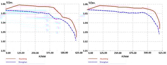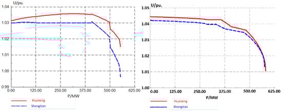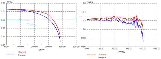 In order to verify the correctness of the method proposed in this paper, through the P-U characteristic curve of the wind farm in the eastern area of Mahuangou in the Santanghu wind area, the static voltage stability under the control of different types of reactive power compensation devices was analyzed by setting different configuration programs combined with the methods in the literature [,,,,,,]. Taking the Shengtian and Huaneng wind farms in weak areas as examples, the following six programs are simulated and compared.