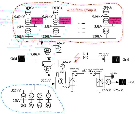 In this section, the characteristics related to the transient voltage stability of the power grid in the Hami region of Xinjiang are further analyzed and studied by the time-domain simulation method. Based on the previous section, it can be known that the static voltage stability of the power grid near the Santanghu wind area in the Hami region is lower compared to the other two wind areas, and is the weak point of the voltage in the whole Hami region. Thus, the Santanghu wind area is the focus of this section, and the model built is shown in Figure 11.