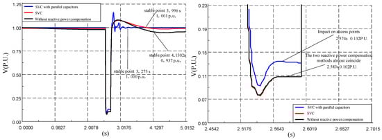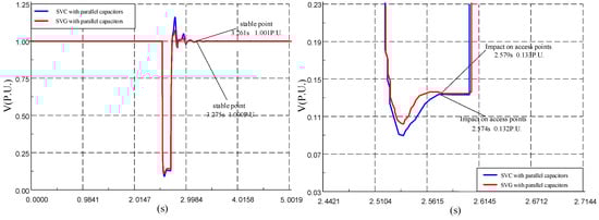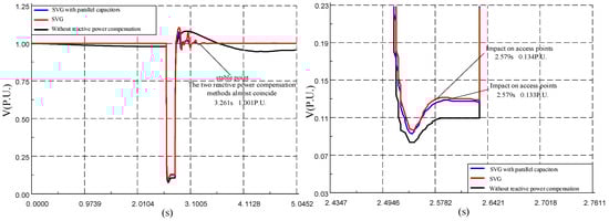 According to the above three comparison programs, when the system fails, both the SVC + SC and the SVG + SC combination can effectively suppress voltage sags, but when the fault is removed, the SVG + SC combination performs better in the voltage recovery stage. Therefore, compared with other reactive power compensation programs, the SVG + SC combination has obvious advantages in transient voltage stability. It is also more suitable to adopt the proposed reactive power compensation combination program where the voltage is weaker in the wind power gathering area.