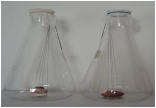 The study was conducted over 11 days. The development of necrophagous Diptera is influenced by the atmospheric conditions; thus, temperatures above 35 °C and beneath 12 °C are considered factors that limit the activity of insects [36,37,38,39]. In our case, temperature was constantly maintained at 25 °C. Females were captured using a previously prepared experimental trap, consisting of a chicken meat support. Females were identified/determined and placed in the Erlenmeyer glasses used in the experiment. They were allowed to lay the eggs, later being released. Species and stages of insect development were determined based on Romanian fauna [26,27]. After this, the monitoring of the evolution of larval development was started. An adult female was placed in each glass. The evolution of larval development was monitored closely, hour by hour, until the onset of the first larval stage and then at an interval of 5 h to follow the onset of the other stages, establishing the time for each subsequent stage. For each development stage, ten individuals were analyzed gradually, according to the study of maggots. The experimental protocol consisted of capturing adult Calliphora vicina females and placing them in the experimental containers for spawning. Eggs were obtained by introducing adult insects in two Erlenmeyer glasses with a narrow entry measuring 165 × 285 mm, where substratum samples (pig tongue and eye) had been introduced previously. Because the Erlenmeyer glasses were tall, the organs were tied with strings in such a way so that they could be easily lifted at any time in order to be studied. The glasses were placed in an oven with a constant temperature of 25 °C, where the growth of the maggots was studied and periods for their development were established (Figure 1).