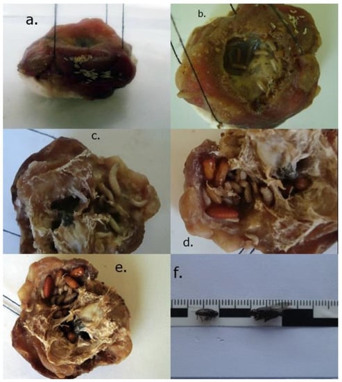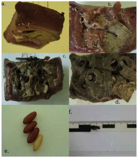 Developmental stages, Calliphora vicina, pig tongue: (a)—eggs; (b)—larva stage I; (c)—larva stage II; (d)—larva stage III; (e)—pupa; (f)—juvenile.
