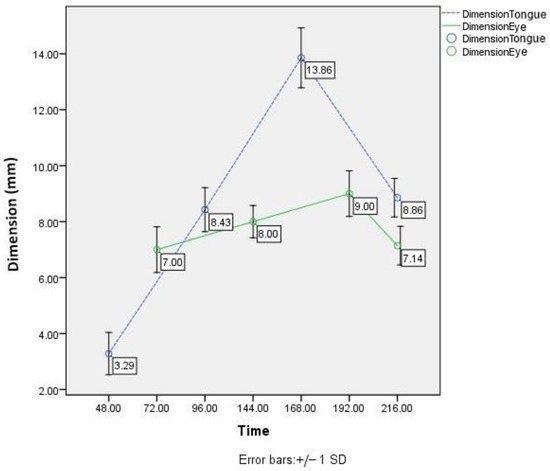 The first larval stage in the nutritionally richer substrate, i.e., on the pig’s tongue, begins after approximately 48 h, while in the case of the pig’s eyes, it starts slower, after 72 h. It should be noted that the actual development time compared to the time when the larval measurements were made varied by +/− 2–3 h.