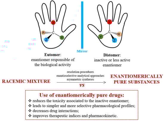 The ability of chiral molecules to interact differently with left versus right circularly polarized light is known as optical activity and is one of the most extensively studied activities since its discovery at the beginning of the 19th century [1]. An optical active entity (for example, an enzyme or a receptor) recognizes between two enantiomers, selecting the one that fits better, i.e., the one that gives a three-point interaction with the ligands [2]. The enantiomer responsible of the biological activity is called “eutomer”, while the other one, inactive or less active, is referred to as the “distomer” [3]. In 1992, the Food & Drug Administration (FDA) outlined a series of guidelines for the pharmaceutical development of single enantiomers and racemates [4,5]. Nearly 56% of the pharmaceuticals marketed and used in therapy are chiral compounds and, amongst them, 88% are administered as racemates [6]. Interestingly, 20 out of 35 pharmaceuticals approved by the Food and Drug Administration (FDA) in 2020 are chiral [7], and a growing tendency to authorization requests for chiral drugs has been ascertained. In recent years, an increasing trend in enantiomerically pure substances has been observed in medicinal chemistry in order to reduce the toxicity or side effects associated with the inactive enantiomer [8,9]. In any case, the decision to use a single enantiomer versus a mixture of enantiomers of a particular drug should be made on the basis of the data from clinical trials and clinical expertise. The use of the single enantiomer drugs may lead to simpler and more selective pharmacological profiles, improved therapeutic indices, simpler pharmacokinetics and decreased drug interactions, and also requests to determine and control the enantiomeric purity of the enantiomers from a racemic mixture (Figure 1). In this context, chirality has become a significant challenge in the synthesis and development of drugs [10]. Different methods have been used to obtain the single enantiomers, which make use of resolution procedures, enantioselective syntheses, and enantioselective analytical approaches [11,12,13,14,15,16]. Specifically, enantioselective gas chromatography [17,18], supercritical fluid chromatography [19], high performance liquid chromatography [20,21], ligand-exchange chromatography [22], and chiral electrochromatography [23] are used. Recently, molecularly imprinted technique (MIT) has received wide consideration for the separation of racemates due to its simple operations [24]. Moreover, chiral metal–organic frameworks (CMOF) materials are commonly used for chiral recognition, separation, and catalysis [25]. More new methods for isolation of enantiomers and control of their enantiomeric purity have been proposed [26,27]; however, given the high cost of enantioselective syntheses [28,29] or the separation of enantiomers [30,31], the racemic mixtures of chiral drugs are still often used in therapy. It has also to be considered that the determination of the exact 3D structure of drug candidates is of foremost importance for the pharmaceutical industry in different stages of the discovery [32]. A growing interest of chirality in the exploration of 3D chemical space and modern drug discovery approaches have been recently reported for the high throughput hit identification (hit-ID) [33]. In 1999, Agranat and Caner introduced the term “chiral switch”, which was then modified and refers to the development of a single enantiomer from a chiral drug, previously approved and marketed as a racemate or as a mixture of diastereoisomers [34,35]. Chirality may also influence metabolism of drugs; indeed, it may happen that the metabolite of one enantiomer can be more active than the other isomer [36,37]. Thalidomide is often used as the classical example of a drug that cannot be used as a racemic mixture, given the toxicity of the distomer [38], even though this assumption has been challenged by some authors [39].