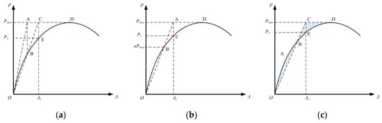 Figure 2. The yield point judgment methods: (a) Geometric Graphic Method; (b) R. Park Method; (c) Equivalent Elasto-Plastic Energy Method. - For R. Park Method shown in Figure 2b [48], the yield displacement and yield point are defined as follows: A secant ‘OB’ is drawn to intersect the lateral load-displacement relation at a certain proportion of the maximum applied shear, i.e., the ‘B’ on the curve corresponding to αPmax shown in Figure 2b. Similarly, this extension of line ‘OB’ and the horizontal line corresponding to the maximum applied shear Pmax intersect at ‘A’, and then projects onto the horizontal axis to obtain the yield displacement ∆y. The intersection point ‘C’ of the vertical and curve is defined as the yield point, which corresponds to the yield applied shear Py.