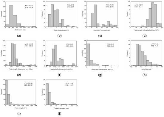 Statistical distribution of the input and output variables: (a) Section size; (b) Span-to-depth ratio; (c) Strength of concrete; (d) Yield strength of longitudinal bars; (e) Yield strength of transverse bars; (f) Longitudinal reinforcement ratio; (g) Transverse reinforcement ratio; (h) Axial load ratio; (i) Yield strength; (j) Yield displacement.