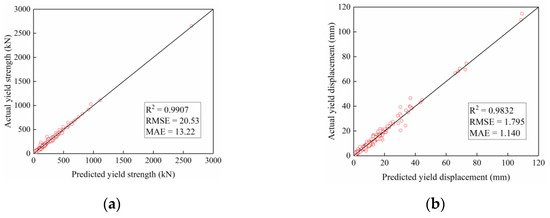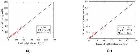 Before evaluating the proposed model, the dataset composed of 382 test results is randomly divided into two sets: the training set (305 data samples) and the testing set (77 data samples). With the optimal parameters in Table 4 adopted, the training performance and testing results of the PSO-LSSVM are displayed in Figure 5 and Figure 6, respectively. The scatter-plots in the two figures show that the proposed model has yielded prediction results that present quite excellent agreement with the experimental test results in both training and testing processes. Moreover, it also can be seen that the PSO-LSSVM earned relatively high values of R2 for testing, the corresponding values of the coefficient of determination (R2) are 0.99 and 0.96 for the training and testing cases of yield strength, respectively (Figure 5a and Figure 6a), and the corresponding values of R2 are 0.98 and 0.97 for the training and testing cases of yield displacement, respectively (Figure 5b and Figure 6b). The high values of R2 imply that a strong correlation exists between the predicted and measured yield point, which indicates that the PSO-LSSVM is proficient at capturing the underlying function of yield strength and yield displacement of RC columns.