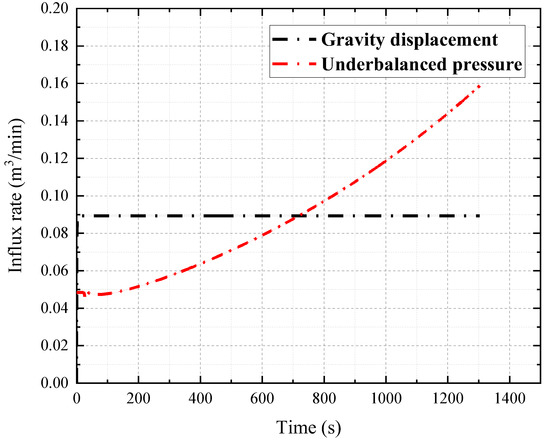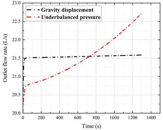 Figure 6 illustrates the variation of the pit gain with time, during the underbalanced pressure gas kick and the gravity displacement gas kick, and their overflow volumes both reach 2 m3 at 1300 s. It can be seen that the pit gain under the gravity displacement gas kick is approximately a straight line with time, while it presents a curve with time, during the underbalanced pressure gas kick. The change rate of the pit gain with time is the increment of the wellhead outlet flow rate, as shown in Figure 7. The outlet flow rate under the gravity displacement gas kick increases abruptly at the beginning and increases slowly thereafter, while the outlet flow rate tends to increase continuously during the underbalanced pressure gas kick. Therefore, they can be determined, based on the outlet flow rate.